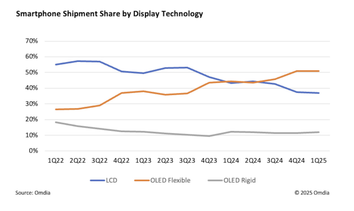 Omdia says that the penetration of OLEDs, and specifically flexible AMOLED displays into the smartphone market is on the rise. In the first quarter of 2025, 63% of all smartphones shipped with AMOLED displays, up from 57% in the first quarter of 2024. The company expects 750 million smartphone OLED displays to ship in 2025, with a market share of over 60%.