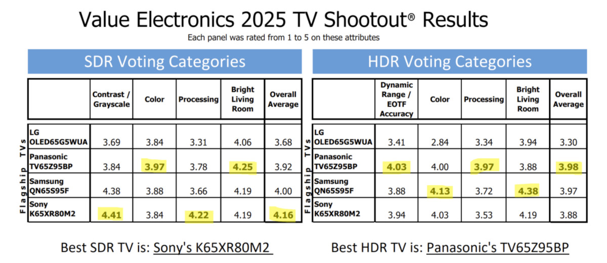 A few days ago we reported on Value Electronics' 2025 TV Shootout, where the winner was Sony' Bravia 8 II OLED TV, beating Samsung's S95F, Panasonic's Z95B and LG's G5. In that order.